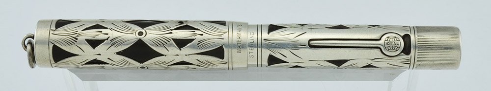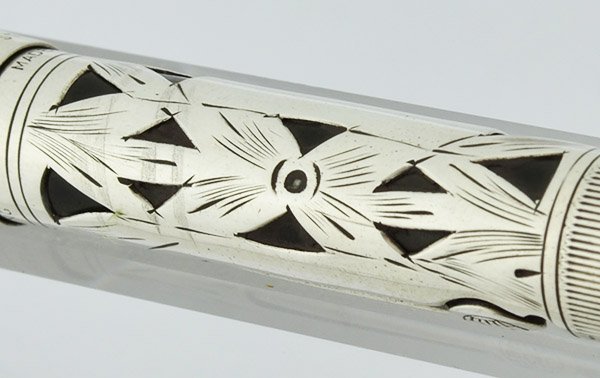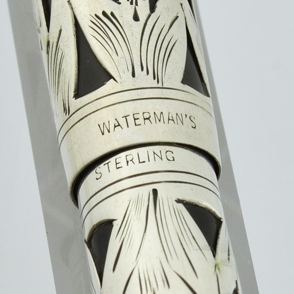 Condition Excellent condition with some light wear. There are a couple of light lines of wear around the barrel (sort of visible in the second to last photo), and some light denting in the end of the barrel, and a little wear on the sterling there from posting the cap. The cap posts snugly on the end of the barrel. Naturally, posting it will add to the wear. The hard rubber underneath the filigree is quite nice, not looking especially discolored. There are no chips or cracks, and all of the imprints appear to be quite crisp and readable. It's restored and working very well.