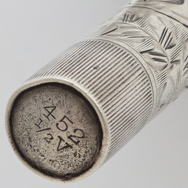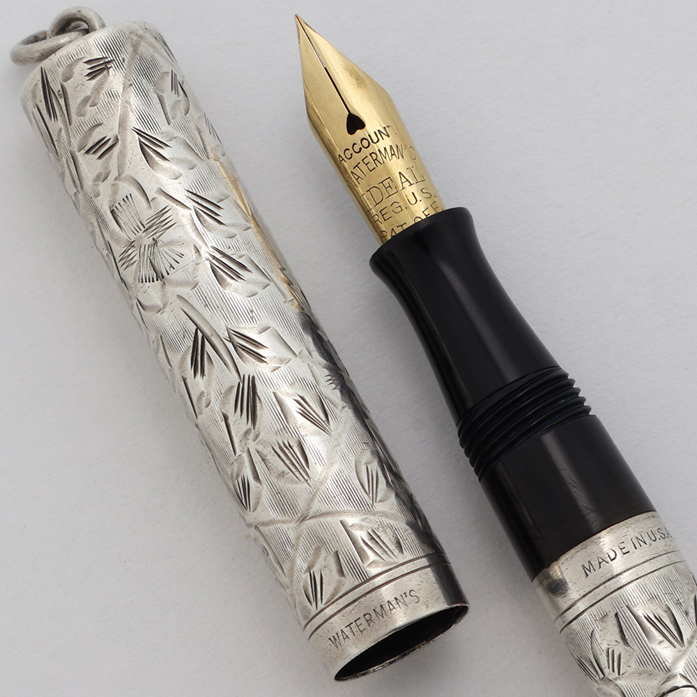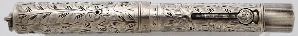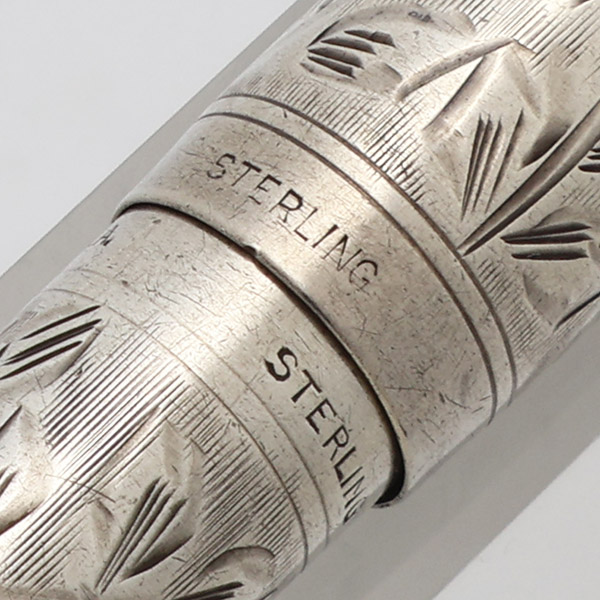 Condition Excellent condition with no cracks, chips, dents, or dings. This is a very small pen with lovely floral engraving on sterling silver. There is moderate microscratching on the cap and barrel but this does not affect the floral pattern and the pen looks really nice. There is some tarnish under the ring top. The ring itself looks good. The end of the pen with the engraved model number has heavy scratching and some tarnishing. There is a personalization, initials HPS, on the barrel. The imprints are clear.