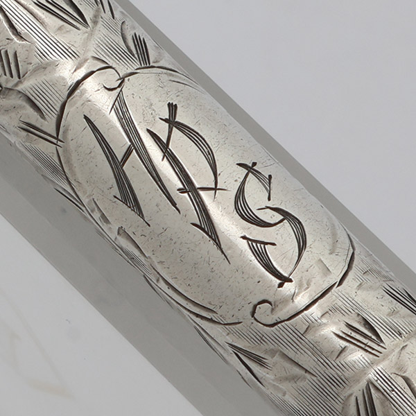 Color Fully engraved sterling silver cap and barrel with floral pattern. There is a personalization, initials HPS, on the barrel.