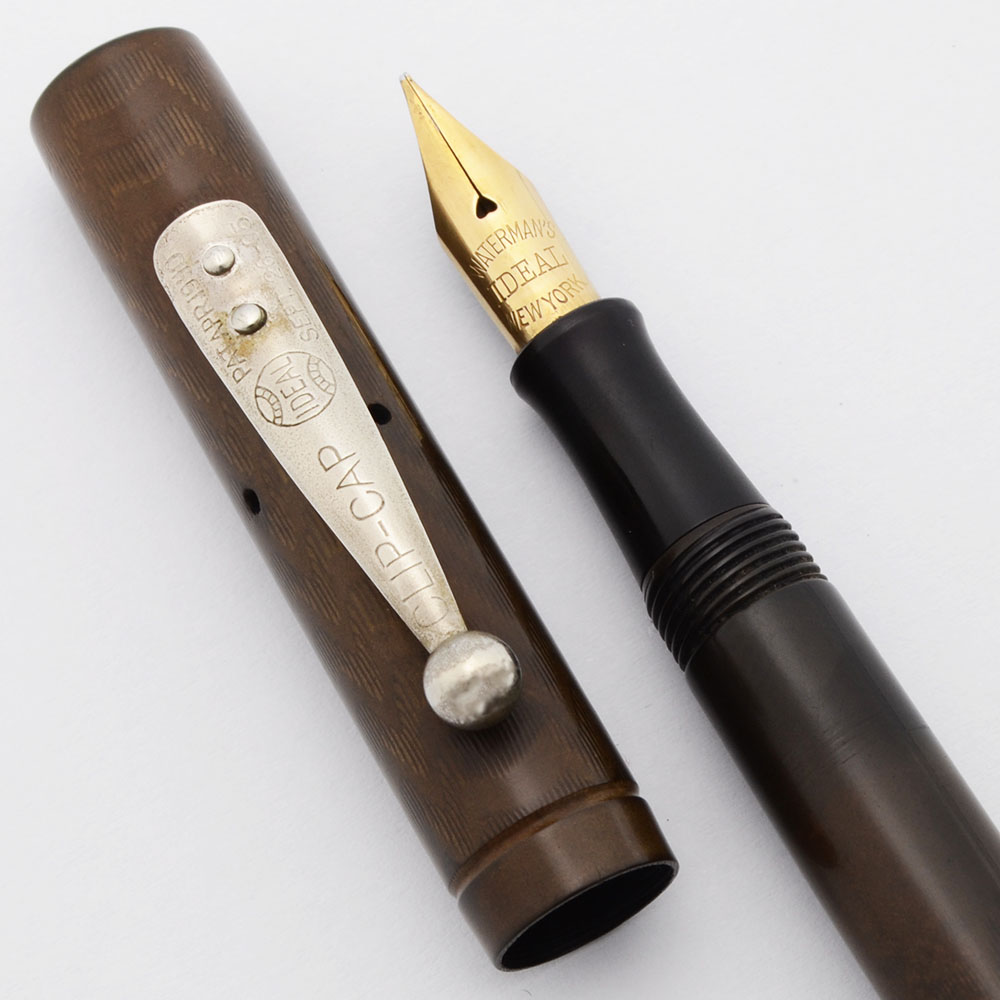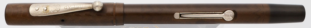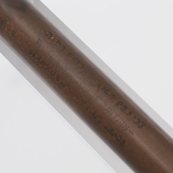 Condition Excellent condition. The black hard rubber has faded significantly, and much of the body is olive-colored. The chased surface is largely smoothed down, but you can still see the shadows of the pattern. Very little scratching, and no chips or cracks. The clip and lever both have brassing and plating wear, but no serious pitting. The imprints are smoothed but still readable.