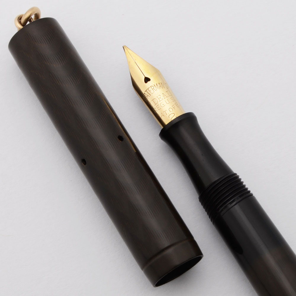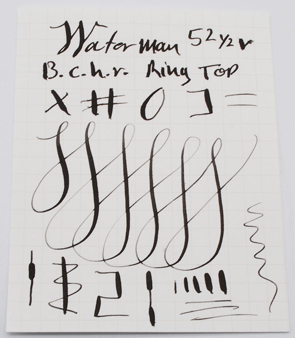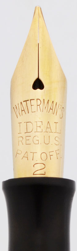Nib Flexible gold nib. The nib reads "Waterman Ideal Reg. U.S. Pat. Off 2" and has just about full flex. Please see the writing sample below. The nib looks like it could be a medium, but the writing sample shows almost an extra fine to double broad line variation.