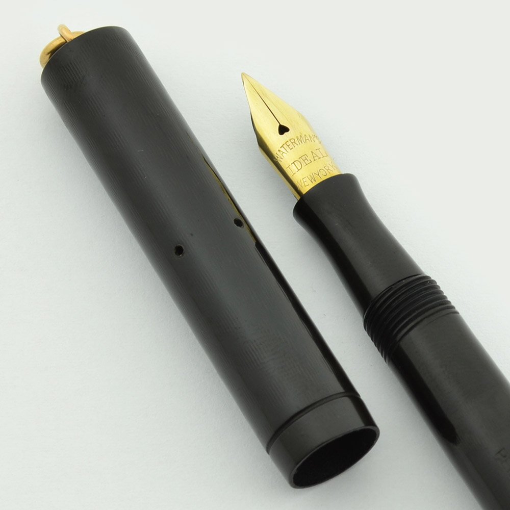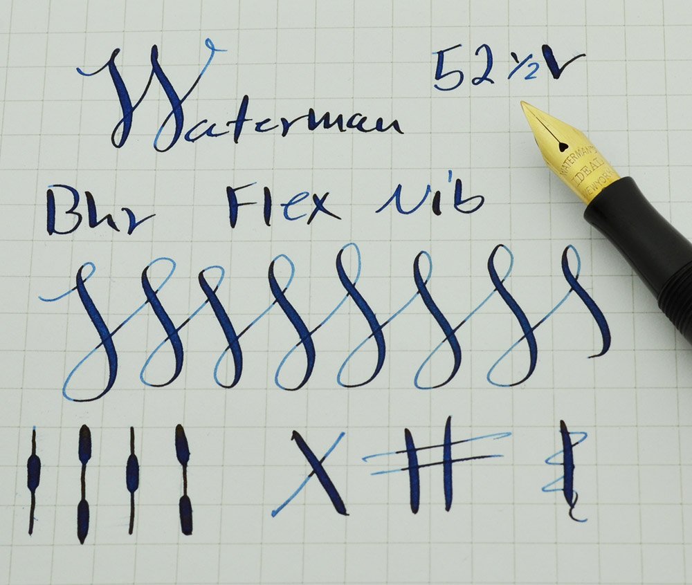 Nib The nib reads "Waterman Ideal New York" and has almost full flex. Line variation from fine to double broad. See the writing sample below.