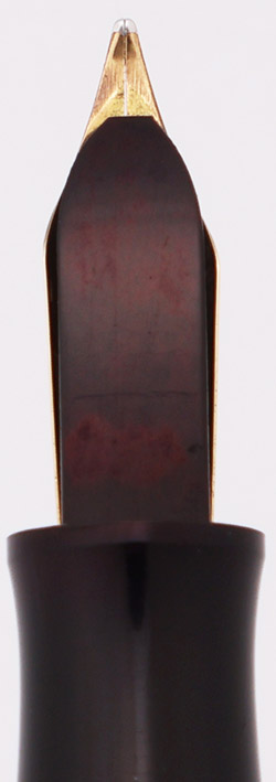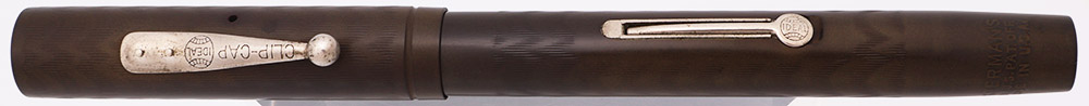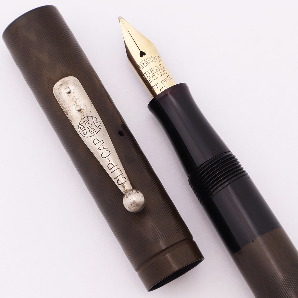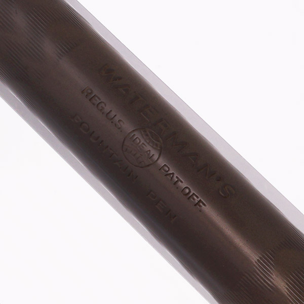 Condition Excellent condition with no cracks, chips, dents, or dings. This is a classic Waterman's 52 fountain pen that has mellowed in color to a deep chocolate brown. The original black color can be seen on the section. The chasing is all intact and the cap and barrel look excellent. The clip and lever have a moderate surface wear with some microdots of pitting. All imprints are clear.
