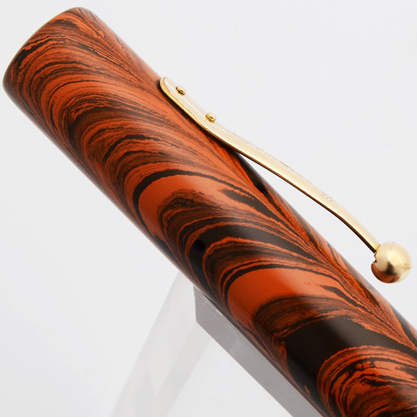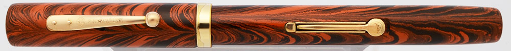 Condition Excellent + condition with no cracks, chips, dents, or dings. This is a beautifully patterned classic pen with gorgeous coloring. The barrel has light marks caused by the cap lip. Other than that, the cap and barrel are near-perfect. The lever, cap band, and clip all have plating wear and the cap band has brassing. The clip stands out a bit from the cap (see photo below) and there are short cracks coming off the lower pin that secures the clip (also visible in photo). The imprints near the end of the barrel are somewhat faded but they can be read with magnificantion. The "52" imprint on the end of the barrel is clear.