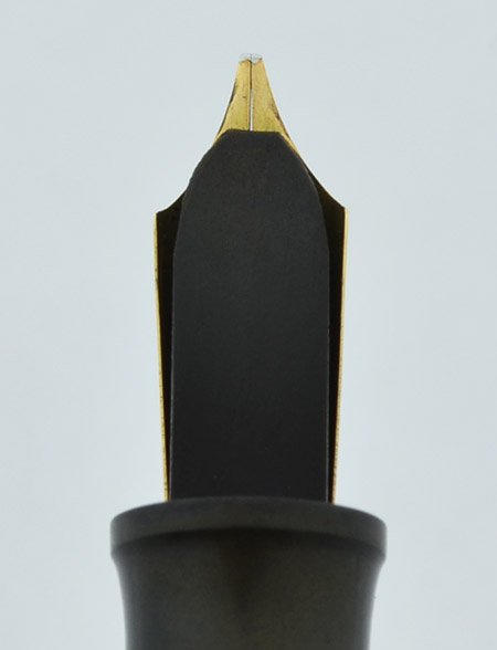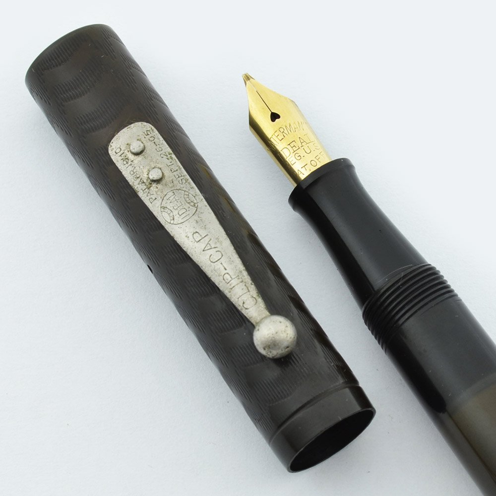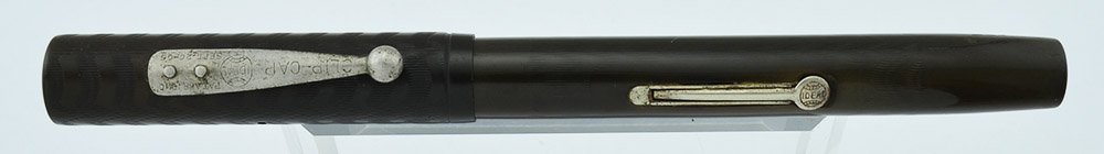 Condition Excellent condition, with a little wear. The color has lightened a bit to a slightly brownish color, you can see the contrast between the part of the barrel that's covered by the cap and the part that's exposed. There's a little scratching on the end of the barrel, and a few small scratches on the cap as well. The trim is a bit dull, but the body of the pen is very shiney, with a nice imprint that is still visible. No cracks, chips, or personalization. It's a desireable pen, especially with the interesting nib on it.