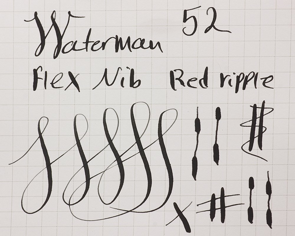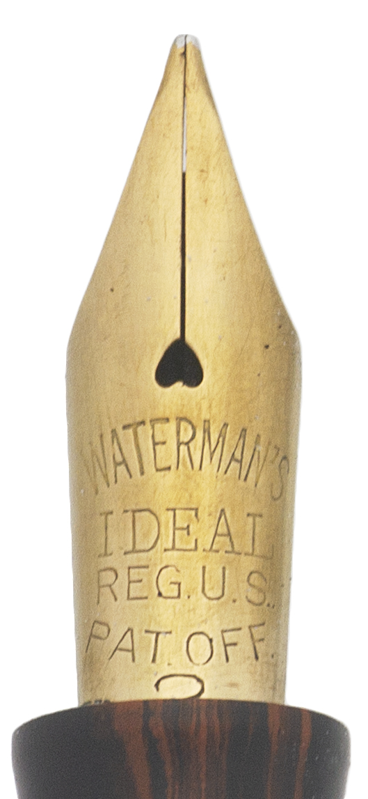 Nib Fine flexible Waterman's Ideal gold nib. The #2 nib writes smoothly with strong line variation. Please see the writing sample below. The nib has a red ripple hard rubber feed which is correct.