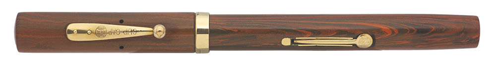 Condition Superior condition. The color and patterning is just about perfect. The red is vivid and the black is dark. All three imprints on the barrel are easily read. The cap band is brassed on the edges and the clip and lever have some minor brassing as well. There are fine marks throughout the cap. Nothing worse than a ding and difficult to notice without close scrutiny. No cracks or chips.