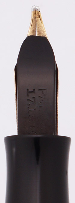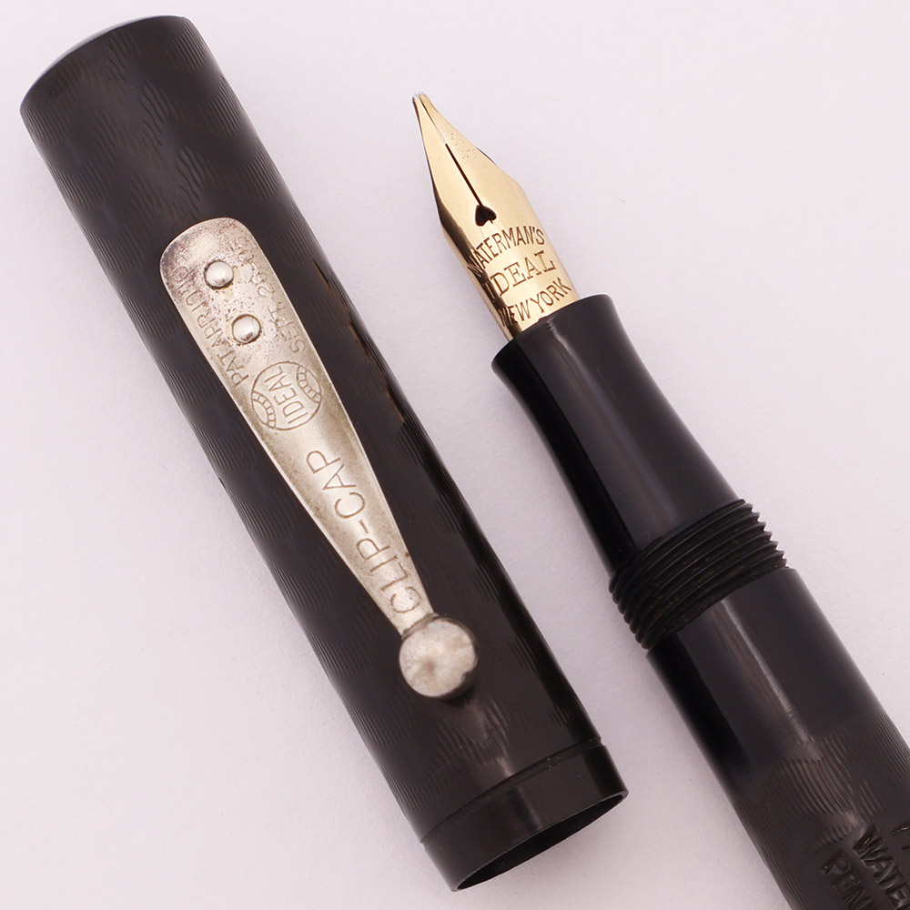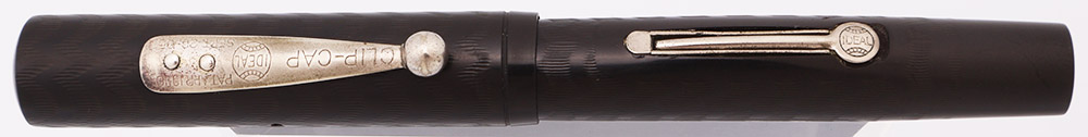 Condition Excellent condition with no cracks, chips, dents, or dings. This is a dark black, vintage pen, with excellent chasing and shine. The color is excellent, a solid dark black. The barrel has marks caused by the cap lip. The cap and barrel have just some light scratching. The lever and clip have light plating wear. The imprints are crystal clear.