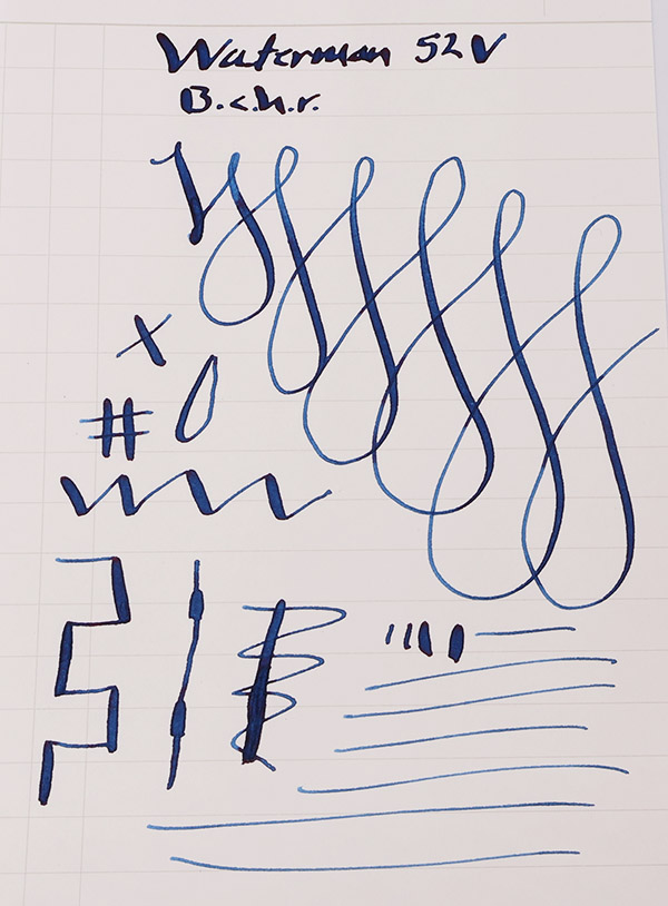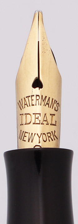 Nib MEDIUM FLEXIBLE Waterman's Ideal New York Nib. There is a short crack coming down from the heart shaped breather hole, so be careful not to over-flex the nib. Line variation from medium to broad. See writing sample below.