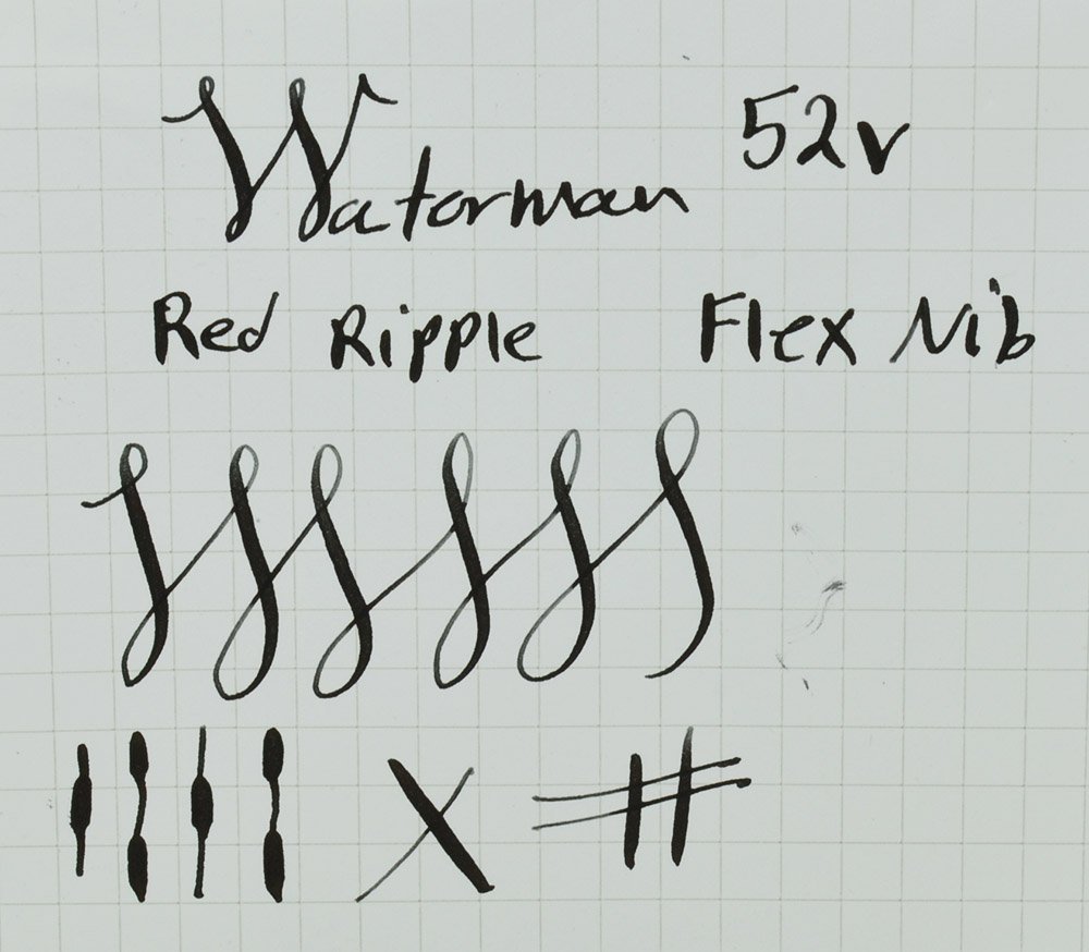 Nib FLEXIBLE MEDIUM Waterman's Ideal gold nib is smooth with lovely tipping material. It's close to what we would call fully flexible, with easy line variation from fine to a broad + under just light pressure, and a bit more under a weightier touch. See our writing sample below.
