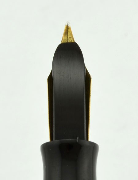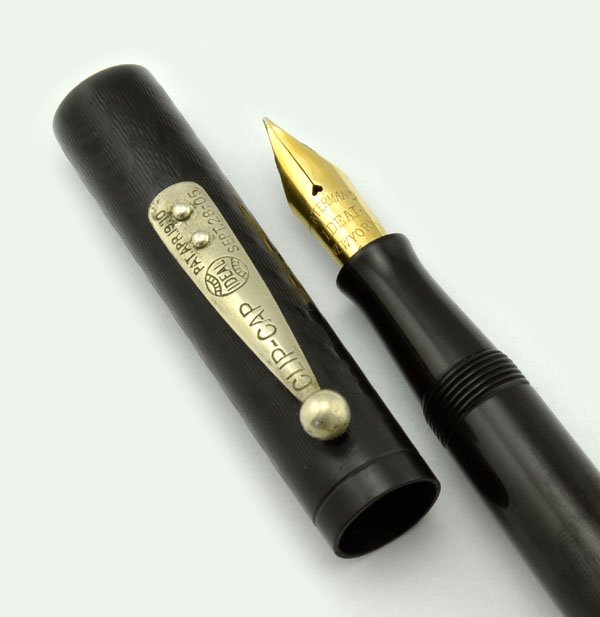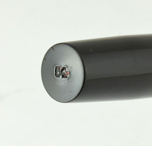 Excellent condition. The hard rubber has lightened slightly and the chasing is just a little smooth. The imprints are readable. The trim is in good condition, with some wear. This pen writes very smoothly with a pleasing amount of flex. The filling system is working well, we re-sac'd it and we'll guarantee it for two years. |