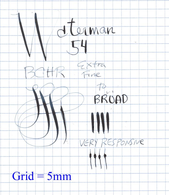 | Nib | The nib is marked Waterman's Ideal New York 4. It is nicely flexible with a good ink flow, not fully flexible or a wet noodle ... and a lot of tipping material. The nib is notably smooth and responsive with excellent spring back. The line varies from extra fine to broad. Writing sample below. |