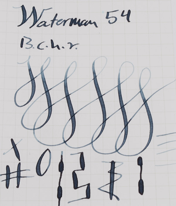 Nib Medium Flexible Waterman Ideal New York #4 nib. It is smooth and flexes easily. We feel comfortable calling it just shy of full flex. It has good hairlines, despite the width. Please see the writing sample below.