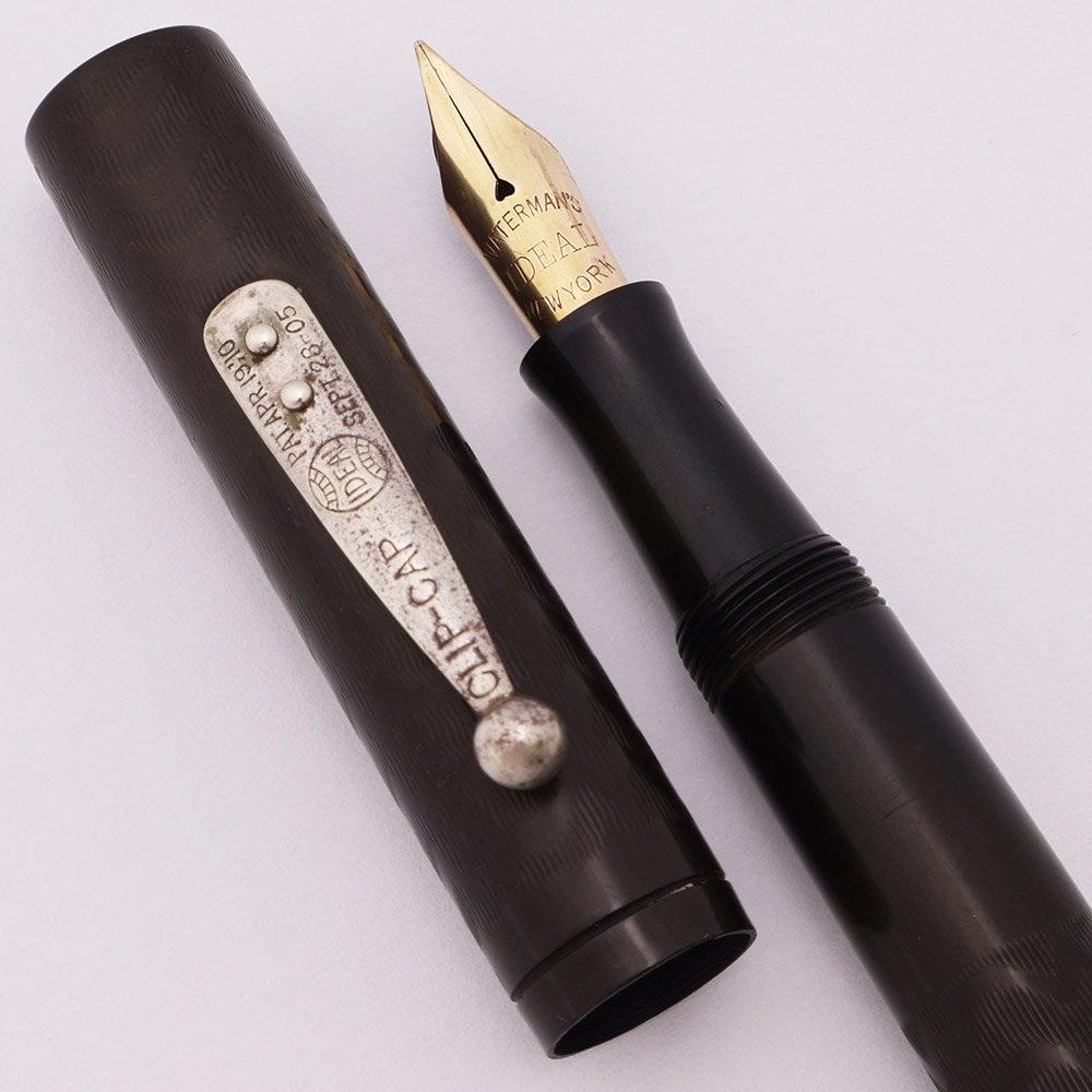 Condition Excellent condition. There is some slight fading of the hard rubber material. The chasing pattern is nice and clear. The clip and lever are a bit rough, with quite a bit of plating wear and pitting. No cracks or deep scratches. The imprints are very clear.