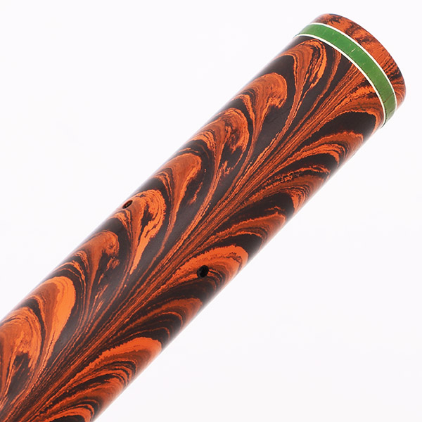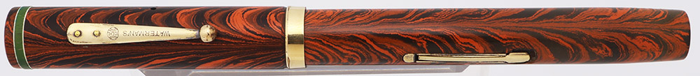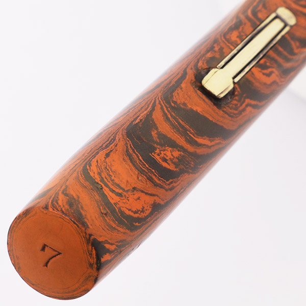 Condition Excellent + condition. There's light handwear and scratching on the cap and barrel. The colorband near the top of the cap has faded a bit, and there is some cracking. There are shallow tooth marks near the top of the cap. The clip has plating wear around the edges, and is securely in place. The cap band has brassing, more on the upper edge than the lower edge. The barrel has marks from the cap lip, and there are tooth marks and some heavier scratching toward the end of the barrel. The lever has some plating wear around the edges. No cracks or chips. The imprints are nice and clear. The red ripple coloring is strong and even.