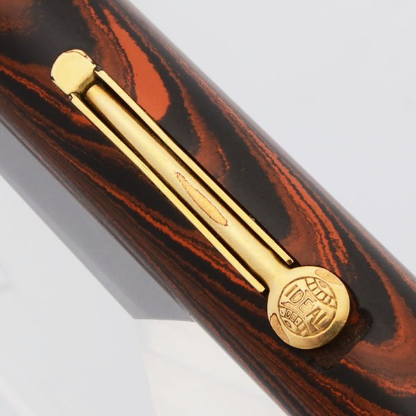 Condition Superior condition. No cracks or chips. The lever has some visible brassing, but the clip and cap band both look excellent with only small traces of brassing. The color is fairly strong, with just a bit of fading evident when uncapped. The imprints are easy to read. The lever box and lever are in excellent condition. the color band has some slight crackling, but it's not excessive. This is really a stunning pen that will be a delight to write with.