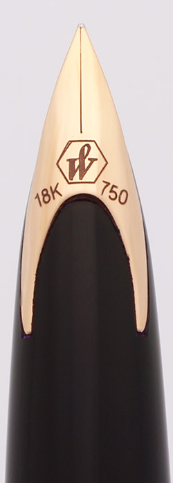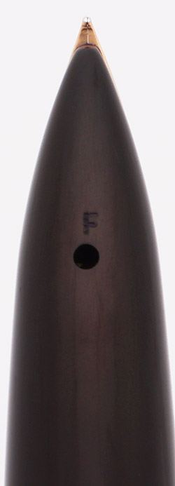 Nib FINE 18k inlaid gold nib. There is an F above the breather hole on the back of the section.