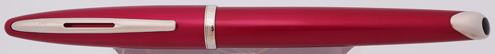 Condition Excellent + condition, in box, with paperwork and with no cracks, chips, dents, or dings. This is a glossy, shiny, beautifully colored fountain pen that literally glows. The cap and barrel have light microscratching. The section has light scratching. All the silver trim has light microscratching. The trim at the end of the barrel has a few scratches and dots of plating wear. The imprint is clear.