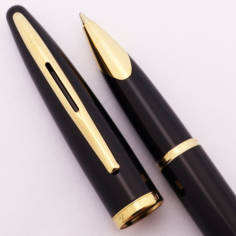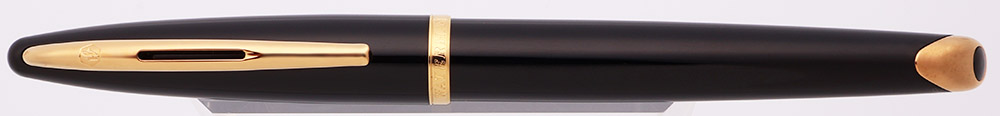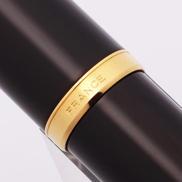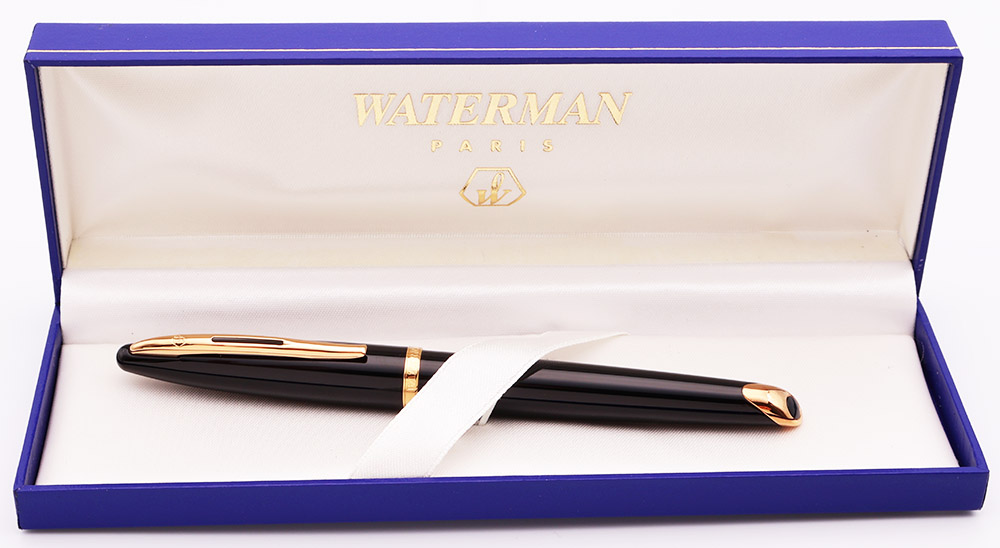 Condition Near mint condition, in blue Waterman box. This is a beautiful, velvety black, shiny pen that has unique gold accents. The cap and barrel are pristine. There is some microscratching on the gold accents and clip. The imprints are clear.