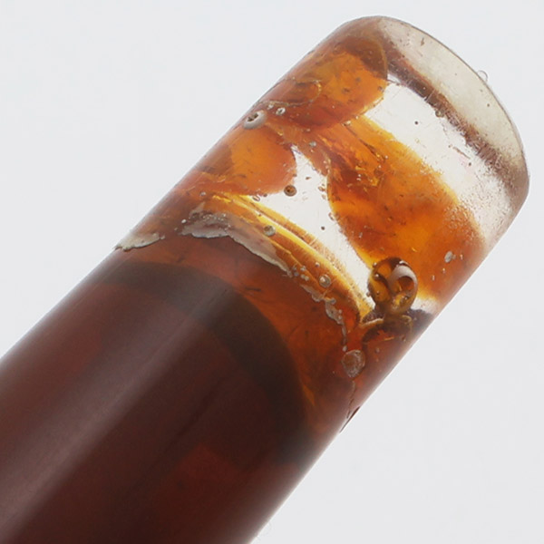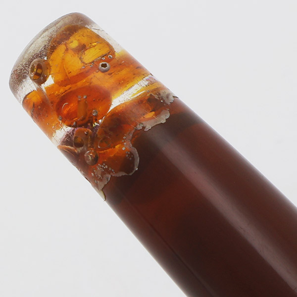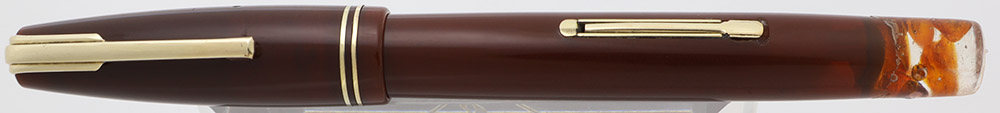Color Amber brown barrel and cap. We believe that this originally had an amber celluloid barrel end piece, but that it has crystallized and someone attempted to replace or repair it. The repair is a bit clumsy and we were told that there are garnets incorporated into it. Garnets come in many more colors than the deep red that's usually associated with the name, and this one seems to have some orange and purple-red varieties. The section is black, and the trim is gold-plated.