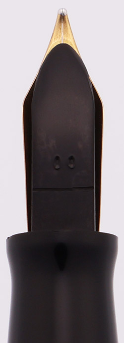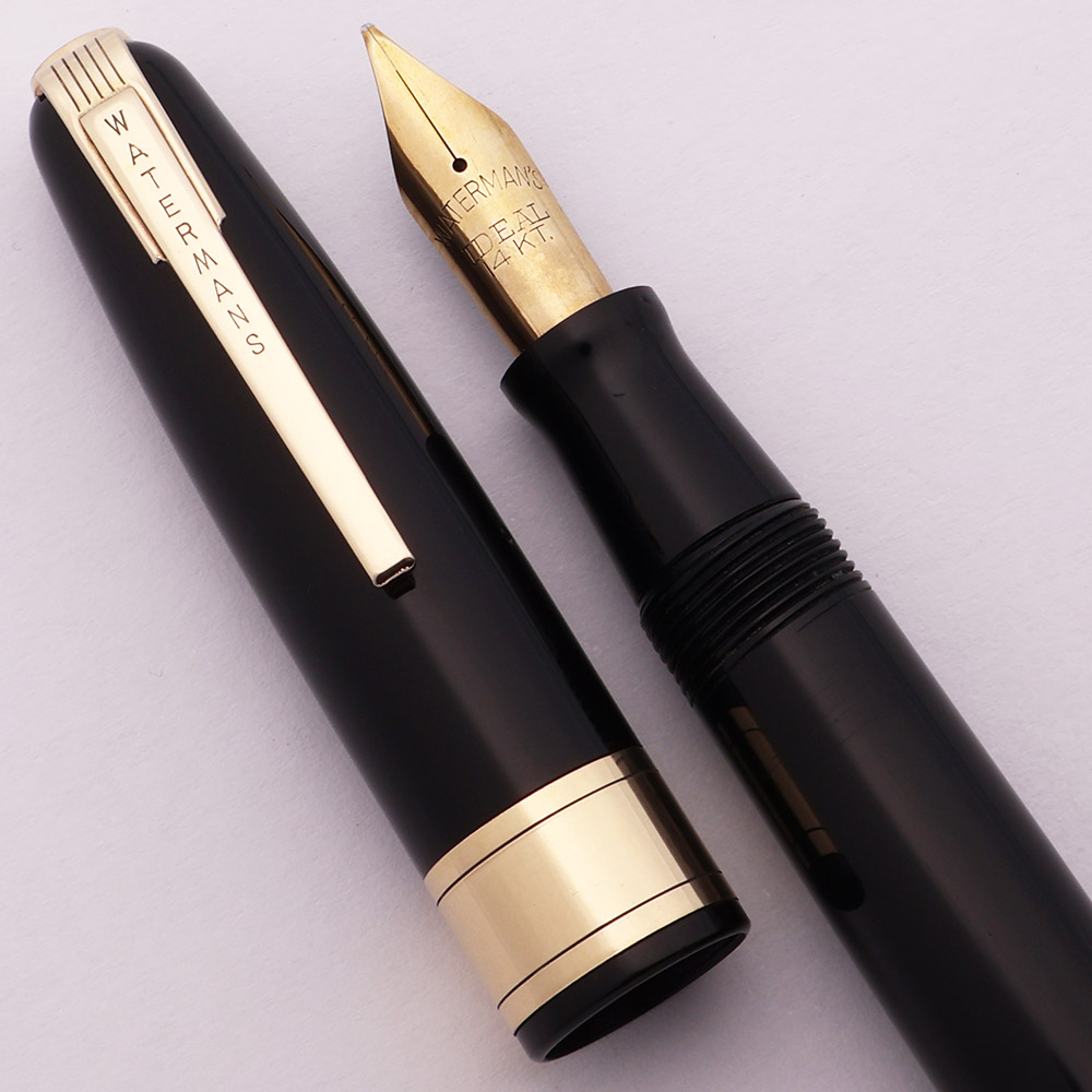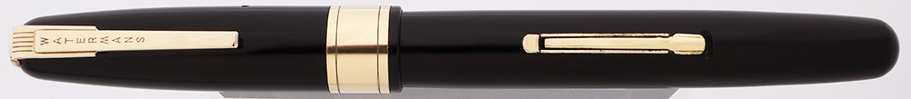 Condition Excellent + condition with no cracks, chips, dents or dings. This is a velvety black, shiny pen with an especially lovely and wide cap band. The barrel has marks caused by the cap lip and some long light scratches near the end. The majority of the barrel looks fantastic -- dark, shiny, and clean. The cap has very light scratching. The lever has a bit of plating wear along the side pieces and at the end of the lever but it looks great overall. The wide cap band is beautiful. The clip has some microscratching. The top gold piece is lovely. The imprints are clear.