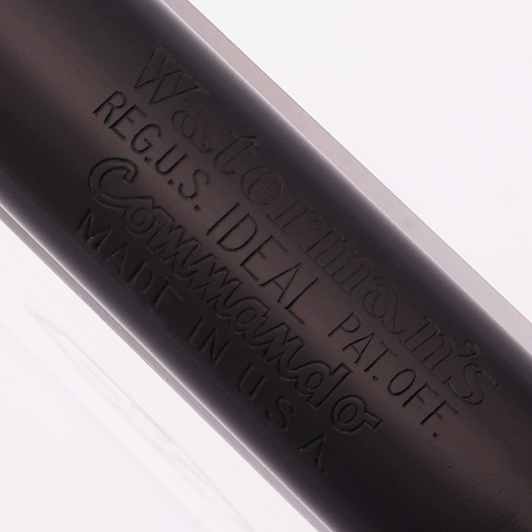 Product Name Commando (it's marked on the barrel). This model was one step down in size from the standard Hundred Year Pen, and otherwise quite similar to the later Hundred Year Pens and Emblem pens. We think the cap came from a Medalist model, associated with the Emblem model. Both cap and barrel are threaded.