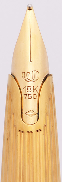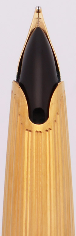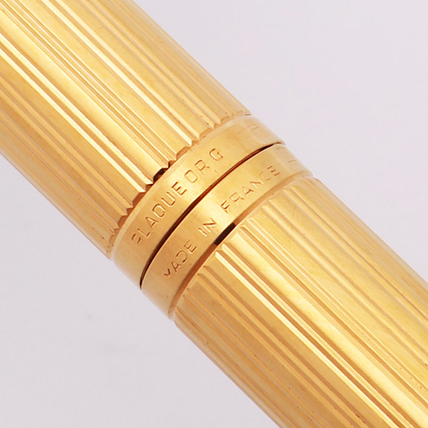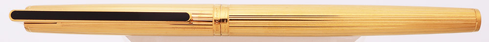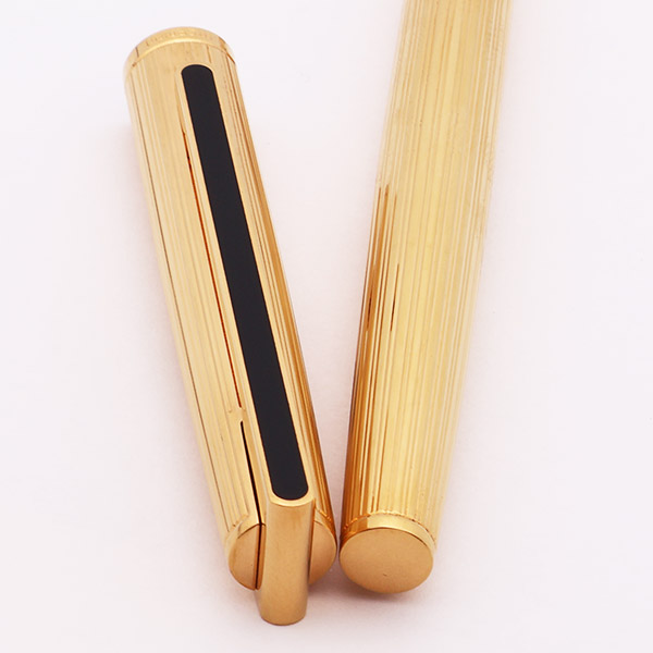 Color Gold plated cap, barrel, and section with a striped pattern. The clip is large and rectangular.