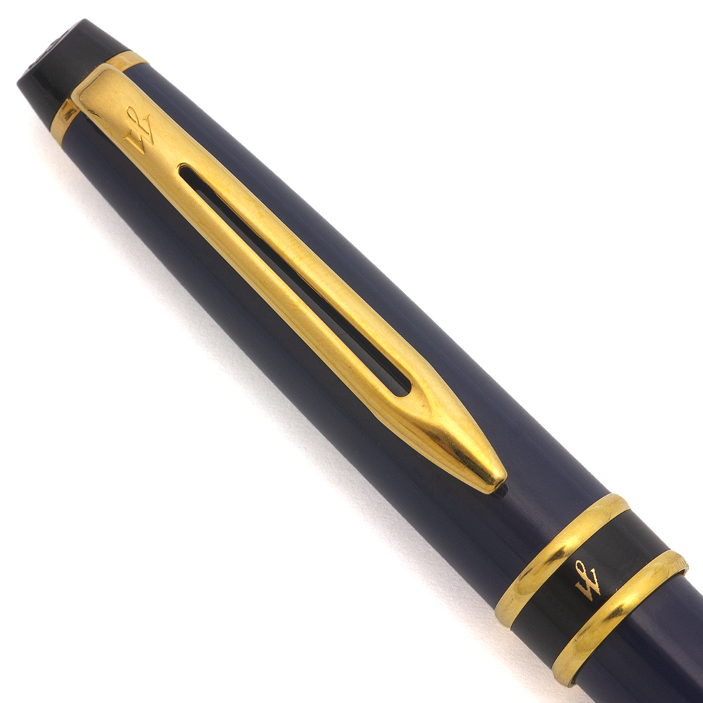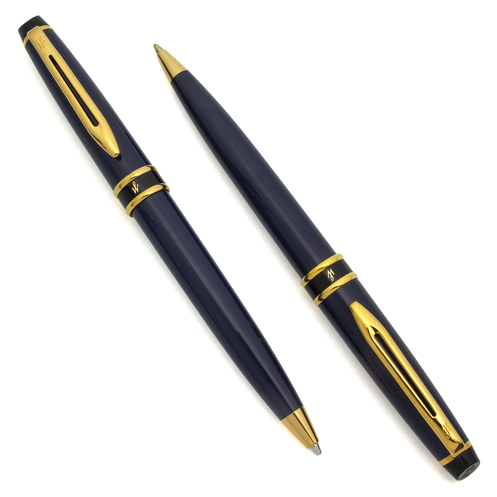 Condition Excellent condition with no cracks, chips, dents, or dings. This is a handsome pen and pencil set with good weighting. Both pieces are in a nice, shiny dark blue. The ballpoint pen has some light scratching on the cap; the barrel looks excellent. The gold cone, double cap band, clip, and clip ring have light microscratching. The black top of the cap has light microscratching. The mechanical pencil has light scratching on the cap and barrel with an area of more moderate scratching to the left of the clip. The cone, double cap band, clip and clip ring have moderate microscratching. The black top piece on the cap has moderate microscratching with some microdot deep marks here and there. The imprints on both pieces are clear.