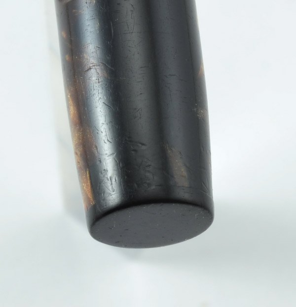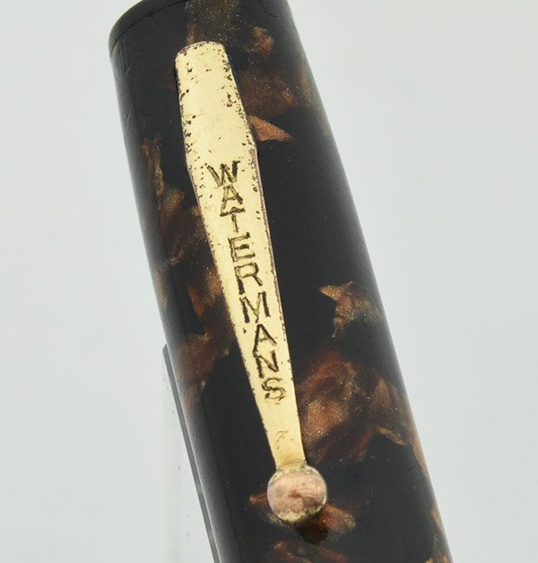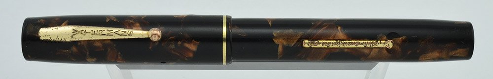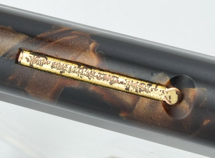 Condition Very nice condition. No cracks or chips. There are bite marks on the cap and barrel. There is lots of brassing on the clip and lever, but the cap band looks good. The imprint is very clear. This pen writes very smoothly. The filling system is working well, and we'll guarantee it for a year.