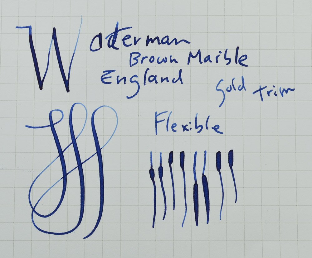 Nib The nib is marked Waterman's Ideal England 2B. It is a fine nib with flexible attributes. See the writing sample below.