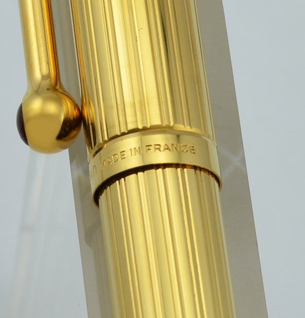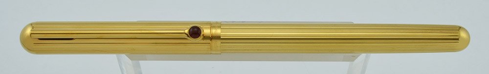 Color Gold lined barrel, cap, and trim. "Plaque or G" gold plated. Red jewel embedded in round end of clip.