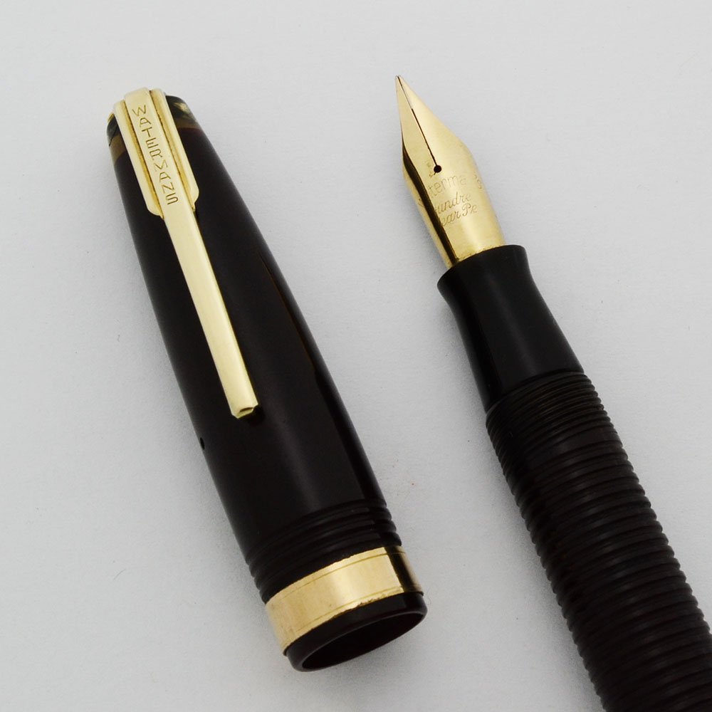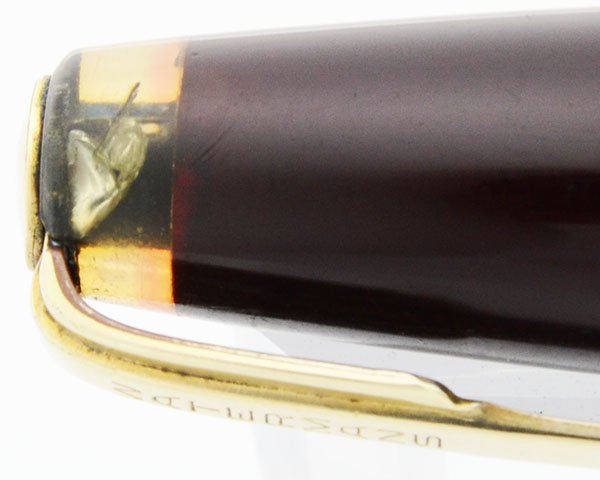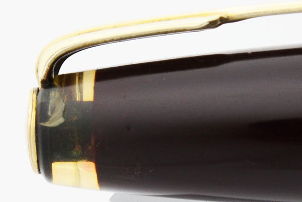 Condition Excellent + condition. The transparent part at the top of the cap is quite clear with some discoloration at the point of contact with the rest of the cap and some internal cracks. The cap band is a bit worn and the cap imprint is crisp. The ribbing is strongly delineated and there are no chips, cracks or scratches on it. The replacement part of the barrel has a scratch. The pen is fully restored and working well.