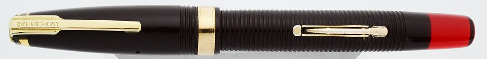 Color Maroon ribbed barrel and cap. When held up in a well lit area, the cap lip can be seen through. Made of celluloid, with a replacement barrel end in red plastic. The original transparent part at the top of the cap is clear amber while the replacement end on the barrel is a bright red.