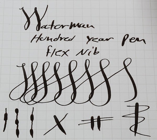 Nib Huge gold Waterman Hundred Year Pen nib. Fine flexible nib. It offers strong line variation. See the writing sample below.