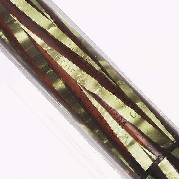 Condition Excellent condition. No cracks, chips, dents, or dings. The trim looks really good; there is some brassing on the sides and around the open end of the clip. The lever has brassing around the edges of the tab, and the rest of the housing looks quite nice. The cap band has microscratching, but looks great. There is light scratching on the cap and barrel. The material is nice and shiny, and the barrel clarity is excellent. The imprints are clear. The emblem on the end of the barrel has some brassing and appears silver in color. The imprint is clear. The pen is working very well.