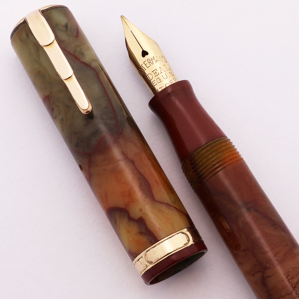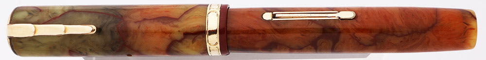 Condition Excellent condition with no cracks, chips, or dents. The main flaw is discoloration to the celluloid, extremely common with this color. Still, this is a small, shiny, prettily colored pen. The cap has a stained/discolored area starting from the clip to the top of the cap. The color on the remainder of the cap and on the barrel is excellent, though more amber than it was originally. The barrel has marks caused by the cap lip and the cap and barrel have moderate scratching. The lever has plating wear along the lower edge and some light pitting along the top and sides. The cap band has some light plating wear along some of the design borders and there are a few little dings. The clip and clip mount have microscratching. The barrel imprints are clear.