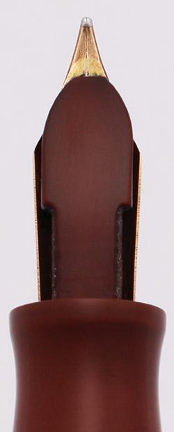 Color "Onyx" color. This is a cream or light caramel color with red veins. (The design doesn't match its name at all.) 1/8" cap band with a simple etched design. The trim is gold filled. The cap lip, section, and feed are a dark red hard rubber.