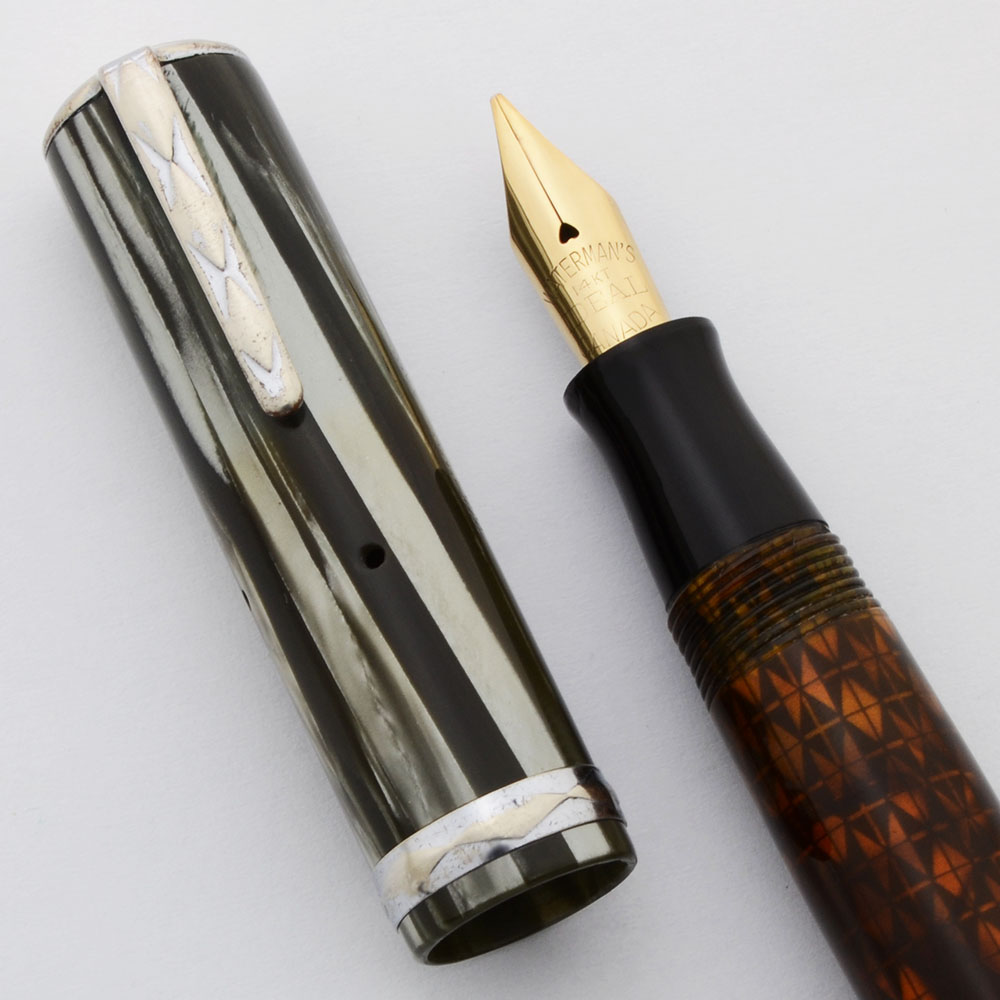 Condition Excellent condition with no cracks, chips, dents, or dings. This is a small, shiny pen in a really pretty color with a darkly ambered ink vue section. The barrel has light to moderate scratching on the grey. The ambered area is not scratched. The lever has plating wear along the edges. The cap has light scratching. The cap band and clip have plating wear. The imprints on the cap and barrel are clear.