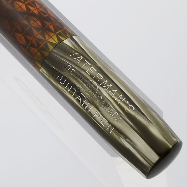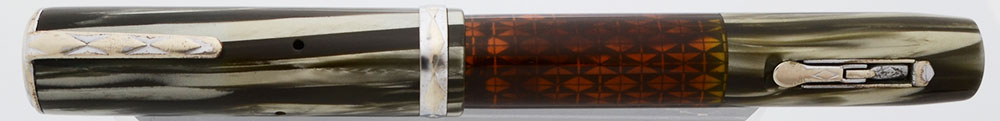 Color Grey swirling finish with a large amber see through area which gives this pen the name "Ink Vue." Chrome or shiny nickel plated trim. The cap band is 1/8" with a pattern of diamonds all around.