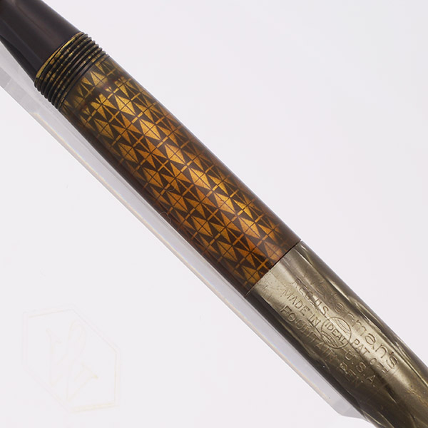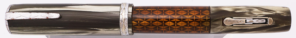 Condition Very nice condition with no cracks, chips, dents, or dings. This is a small, uniquely designed pen, in a pretty color pattern and with a large viewing window. The grey swirly cap and barrel have lots of pearlescence. The large viewing area has mellowed to a greenish-amber hue but there is still viewing capability. The barrel has marks caused by the cap lip and light scratching and microscratching. The lever has light microscratching. The cap has moderate scratching and tooth marks near the top. The cap band has scratching and brassing all around. The clip has moderate scratching and some plating wear. The top of the cap has moderate microscratching. The imprint on the barrel is very clear.