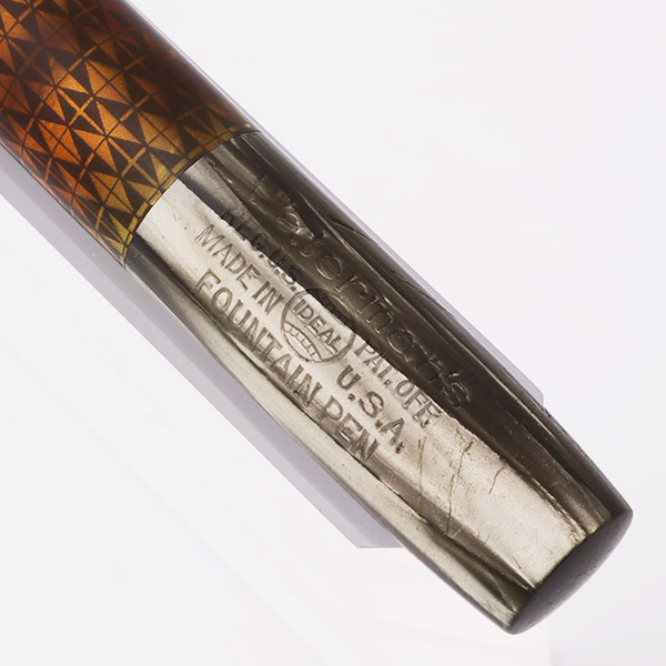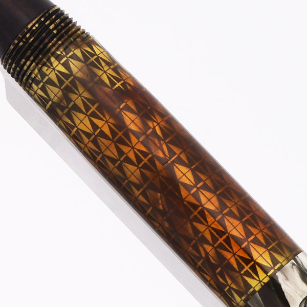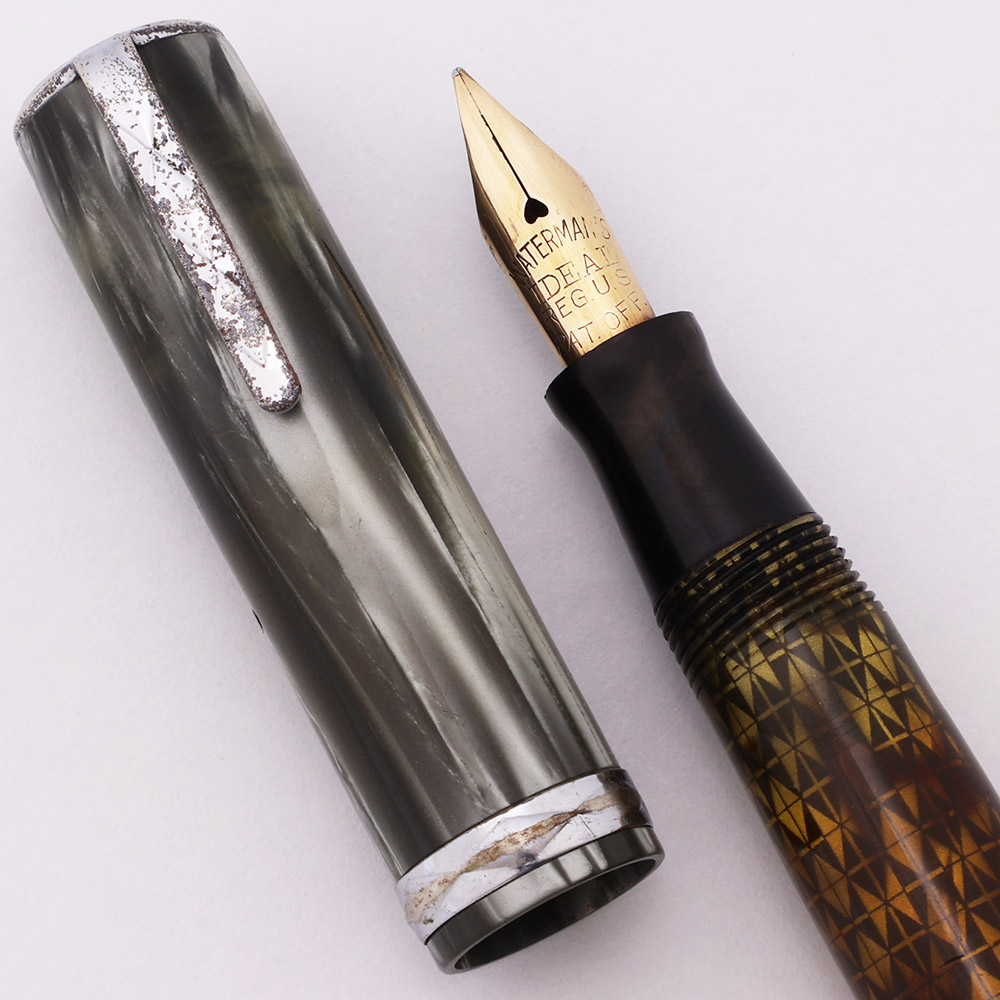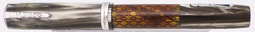 Condition Very nice condition with no cracks, chips, dents, or dings. This is a small, uniquely designed pen, in a pretty color pattern and with a large viewing window. The grey swirly cap and barrel have lots of pearlescence. The large viewing area has mellowed to an amber hue but when you hold the pen up to a light it's quite translucent. The barrel has marks caused by the cap lip and there is light to moderate scratching. The lever and housing have scratching and some brassing. The cap has moderate scratching. The cap band has scratching and brassing all around, and is also slightly loose in its channel. The clip and cap finial have plating wear and some pitting. The imprint on the barrel is very clear.