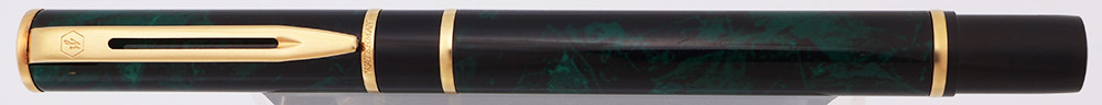 Condition Excellent condition with no cracks, dents, or dings. One tiny chip near the top of the clip. This is a dark green marbled pen that is shiny and that has a slim design. The cap, barrel, and trim all have light scratching. The cone has a line mark near the tip. The imprints are clear.