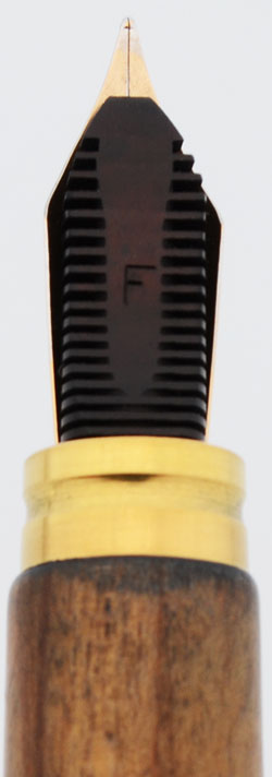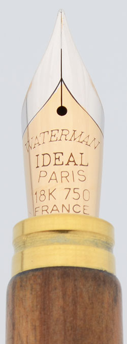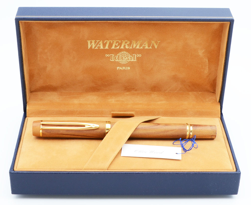 Condition Excellent + condition with no cracks, chips, dents, or dings. This is a beautifully turned olive wood pen with excellent grain and color. There is some darkening (ink stains) at the top of the section and on the very end of the barrel. The two gold bands at the end of the barrel, the cap band, the clip and the clip ring have microscratching. The Waterman imprint on the cap band is clear.