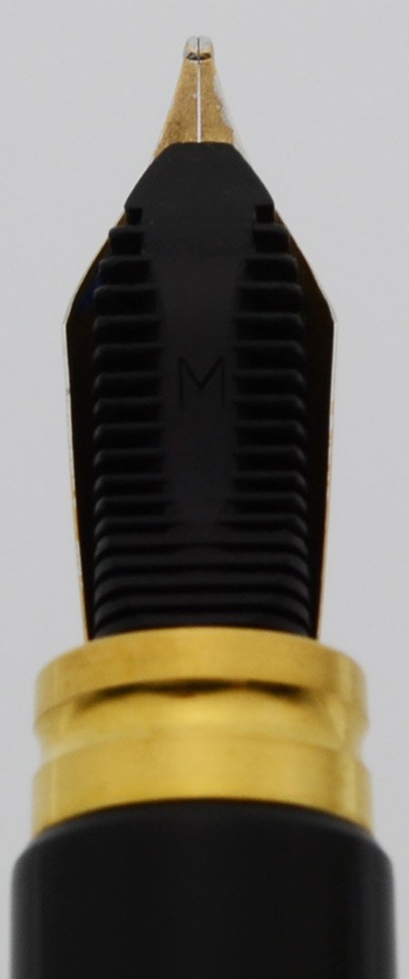 Nib SPRINGY MEDIUM 18k two tone nib. The feed is labeled M. While the tines spread easily they don't spread quite far enough for us to call this semi-flex.