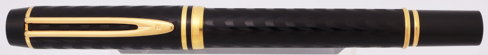 Condition Excellent + condition, in box, with all paperwork and with no cracks, chips, dents, or dings. This is a handsome dark black, shiny pen with even and intact chasing on the cap and barrel. The cap and barrel have some light microscratching. The smooth black end piece has wear around the end, likely from posting. All the gold bands have light to moderate microscratching. The clip has light microscratching. The top gold piece on the cap has light microscratching. All imprints are clear.