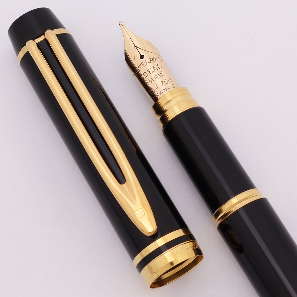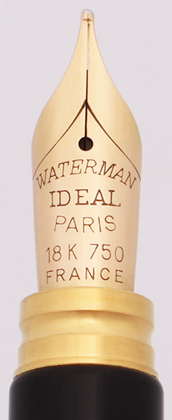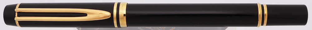 Condition Excellent + condition with no cracks, chips, dents, or dings. This is a velvety black, shiny, elegant pen. The cap and barrel have just some light microscratching here and there. The trim bands, cap band, and clip all have light to some moderate microscratching. The imprints are clear.