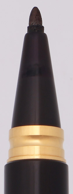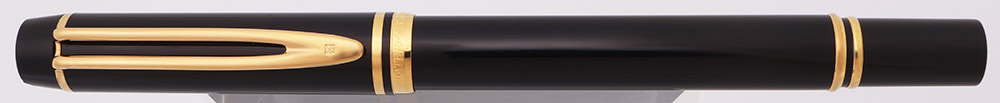 Condition Excellent condition with no major cracks, chips, dents, or dings. This is a velvety black, shiny pen with executive styling. The barrel has mainly light scratching with a few longer, thicker scratches here and there. The barrel end piece has moderate scratching from posting the cap. There is a small 1/4" hairline crack in the plastic cone nearest the pen's tip, and we have included a closeup of this area in the photos. The crack should not interfere with the pen's functioning. The cap looks good. There is a small chip in the top edge of the cap, also highlighted in the photos. The gold trim bands all have moderate microscratching. The cap band and clip have light microscratching. The imprints are clear.