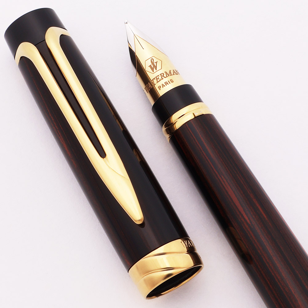 Condition Excellent + condition, in box with paperwork. There are light signs of usage on the cap. The barrel also has light marks, with more moderate scratching from the cap lip. The material is slightly faded on the barrel, with a darker portion underneath where the cap covers it. The front of the section, near the nib, has moderate scratching from the cap. The end finial also has scratching and some scuffs around the end. There is microscratching and some polishing marks on the trim, but no brassing or plating wear. Ships in Waterman box with paperwork.