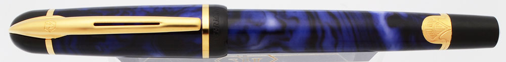 Condition Excellent condition, in box, with paperwork and with no cracks, chips, dents, or dings. This is a beautifully colored, shiny pen that looks regal. The cap and barrel have light to moderate scratching. The gold trim bands and clip have microscratching. The black end piece on the barrel and the black cap lip have moderate scratching. The top derby is excellent. The imprints are clear.