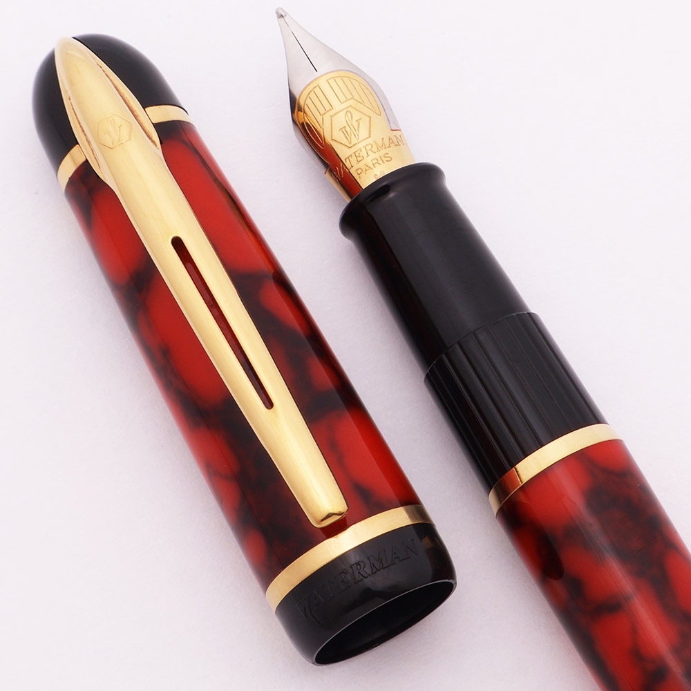 Color Deep red marble with swirls of black. Gold colored trim. Black section, end pieces and a black piece below the cap ring.